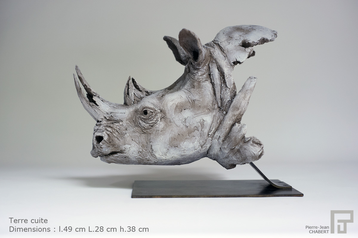 Sculpture animalière/modelage animalier/terre cuite/bronze/tête de rhinocéros/PJ CHABERT